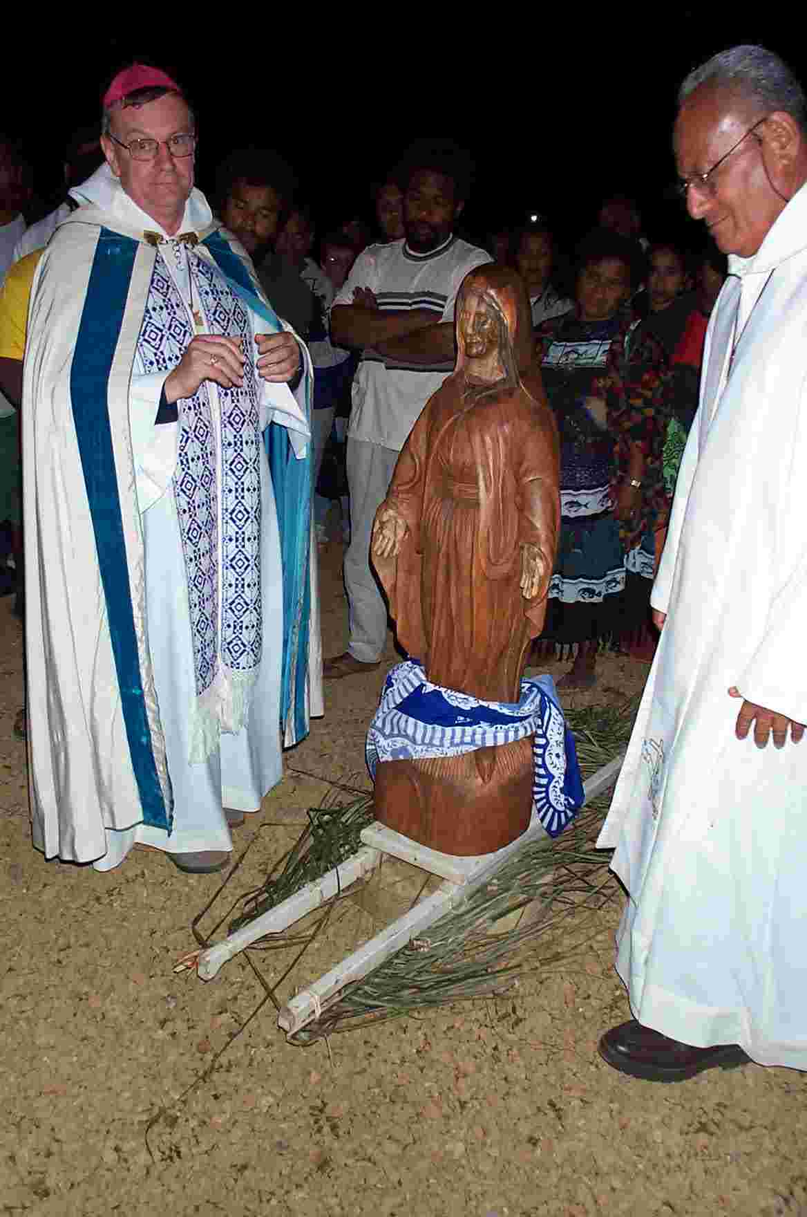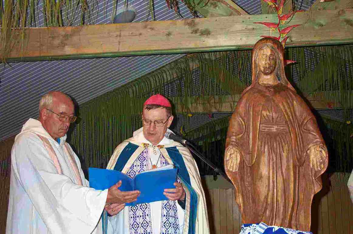 La statue est reçue par Mgr Michel Calvet, archevêque de Nouméa et Mgr Lolesio Fuahea, évêque de Wallis et Futuna |