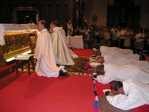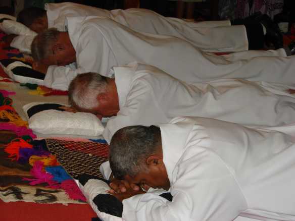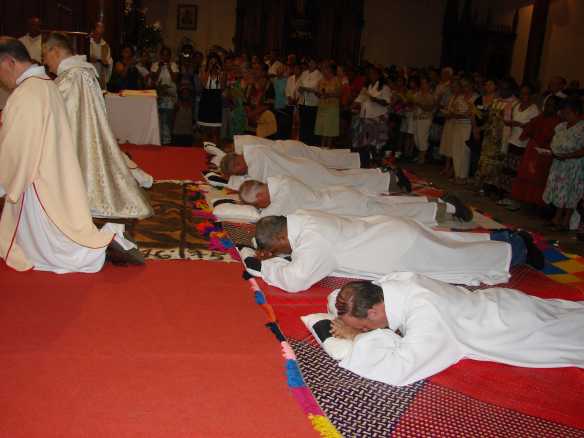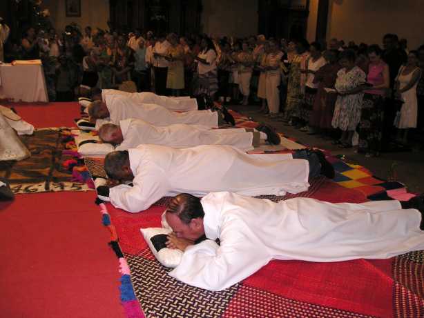 ![]() Les ordinands sont prosternés sur le sol pendant la litanie des Saints |