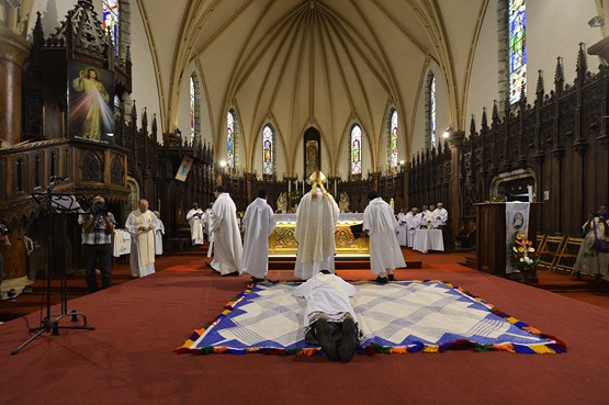 Pendant que le nouveau prêtre bénit les fidèles à l'intérieur de la cathédrale l'archevêque regagne la sacristie |