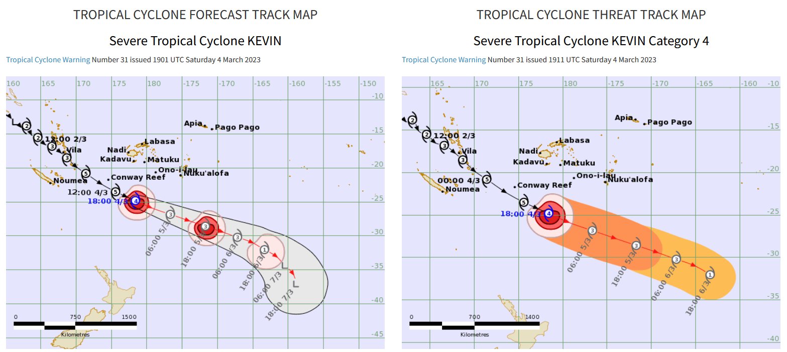 Le cyclone Kevin du 4 au 7 mars 2023 selon le site météo de Nandi