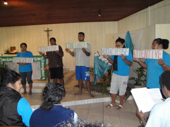 |  Les membres du bureau entourent le président M. Sébastien Leleivai |  Les jeunes maristes guident notre prière |